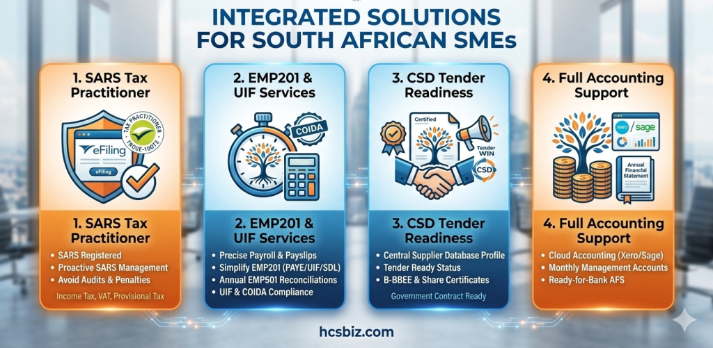 SARS & Department of Labour Filings: We handle your monthly EMP201 (PAYE/UIF/SDL) and annual EMP501 reconciliations.